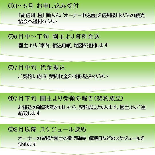 お申し込みは信州松川くだもの観光協会窓口(JAみなみ信州まつかわ地域事業本部ふるさとの館)までお願い致します。下記、松川町のホームページをご確認の上、当園をご指名いただき、お申し込みください。